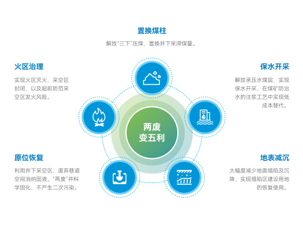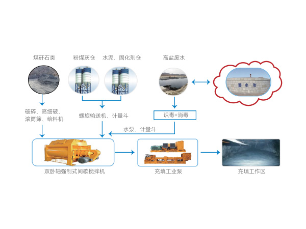 “固液协同”处理技术是指以固体废物(如煤矸石、尾矿库、粉煤灰等)和液体废物(如矿井高盐水、煤化工产生的高盐有机废液等)进行协同处理,再通过一系列的物理、化学等方法进行固化使其稳定化、无害化,达到充填材料的标准并应用于井下充填的一种创新型环保技术。